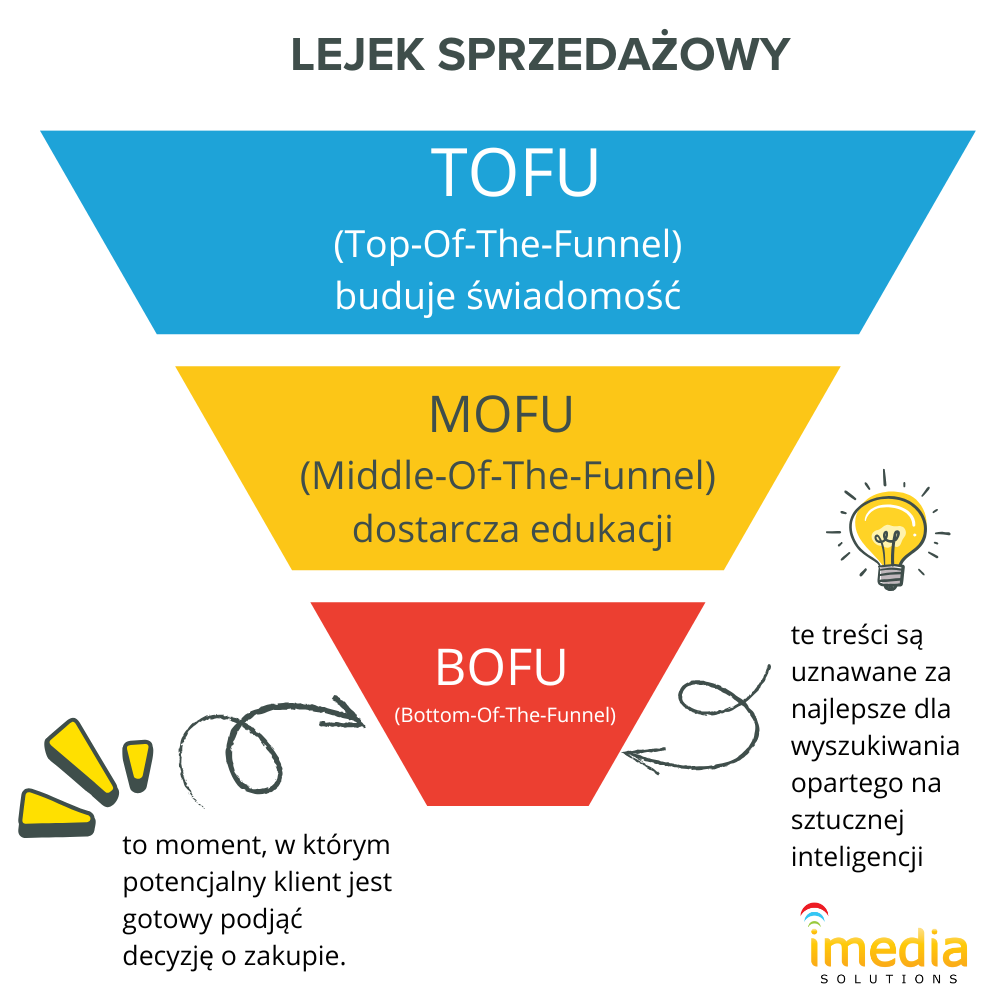 W tradycyjnym marketingu istnieje coś takiego jak koncepcja lejka marketingowego, lejka sprzedażowego. Dzieli on drogę klienta na trzy etapy: TOFU (Top‑Of‑The‑Funnel – górna część) buduje świadomość, MOFU (Middle‑Of‑The‑Funnel – środek) dostarcza edukacji, a BOFU (Bottom‑Of‑The‑Funnel – dno lejka) to moment, w którym potencjalny klient jest gotowy podjąć decyzję o zakupie.