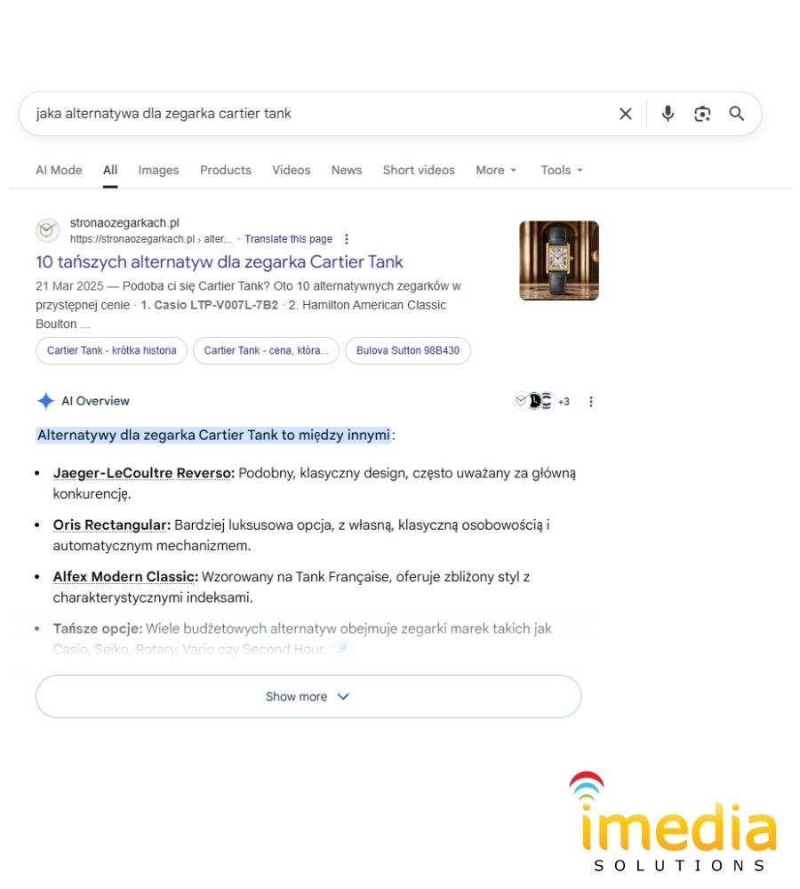 Tutaj mamy kolejny przykład, gdzie tekst bazowy znalazł się powyżej odpowiedzi wygenerowanej przez AI. Wyszukiwarka uznała, że artykuł o alternatywach dla zegarka Cartier Tank jest bardziej wartościowy niż samo podsumowanie stworzone przez sztuczną inteligencję.