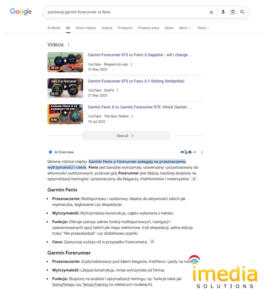 W tym przypadku AI faktycznie wygenerowało podsumowanie porównania modeli Garmin Forerunner i Fenix, ale… umieściło je dopiero pod recenzjami wideo. Co to oznacza? Że algorytm uznał, iż to materiały wideo mają większą wartość dla użytkownika niż tekstowe streszczenie. I trudno się dziwić – recenzja wideo pokazuje produkt w praktyce, pozwala „poczuć” różnice, usłyszeć opinię realnej osoby. AI z kolei zaserwowało poprawne, ale bardzo ogólne zestawienie – bez emocji, bez kontekstu, bez doświadczenia.