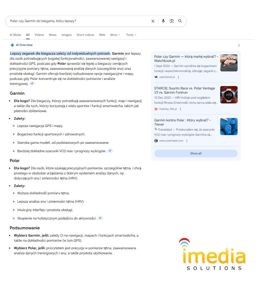 Zresztą, wystarczy rzucić okiem na wyniki generowane przez AI. W przypadku bardzo konkretnych, zakupowych zapytań – np. „Polar czy Garmin do biegania, który lepszy?” – AI często w ogóle nie generuje odpowiedzi. A jeśli już, to są one bardzo ogólne, schematyczne.